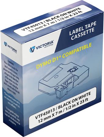 Feliratozógép szalag, 12 mm x 7 m, VICTORIA TECHNOLOGY, fehér-fekete